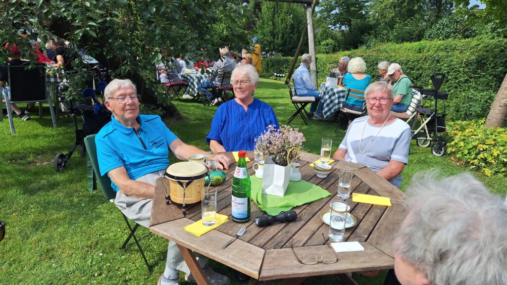 Die Gäste wurden mit einer liebevoll, von den ehrenamtlichen Helferinnen und Helfern gedeckten Kaffeetafel im Garten empfangen. Selbstgebackener Kuchen, frischer Kaffee und die herzliche Atmosphäre sorgten für beste Stimmung. Die musikalische Begleitung durch Finn Böhme und Frederik Kleinschmidt (Die reisenden Musikpädagogen – 100 Orte – 100 Tage) lud zum Mitsingen ein. Auch für Unterhaltung war gesorgt: Verschiedene Spiele und Rikschafahrten brachten Bewegung und Freude in den Nachmittag für alle – Angehörige, Betroffene und Ehrenamtliche.